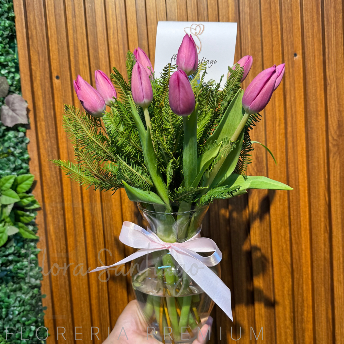Hermoso florero con 10 U De tulipanes color Varía según la temporada