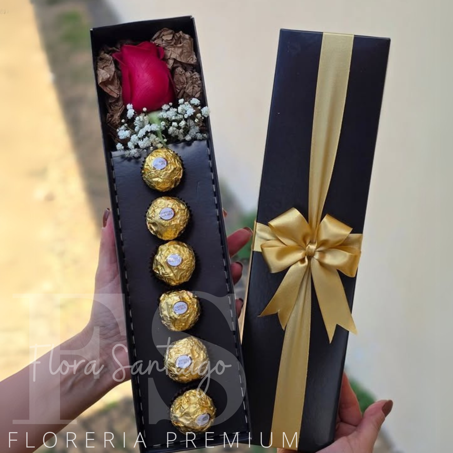 Una delicada y encantadora caja que combina la belleza de una rosa fresca con la dulzura de seis exquisitos bombones de chocolate. Presentada con un elegante lazo, esta creación es el regalo perfecto para cualquier ocasión especial. La armonía entre la flor y el chocolate transmite un mensaje de amor y sofisticación, haciendo de este detalle un obsequio memorable y lleno de encanto.