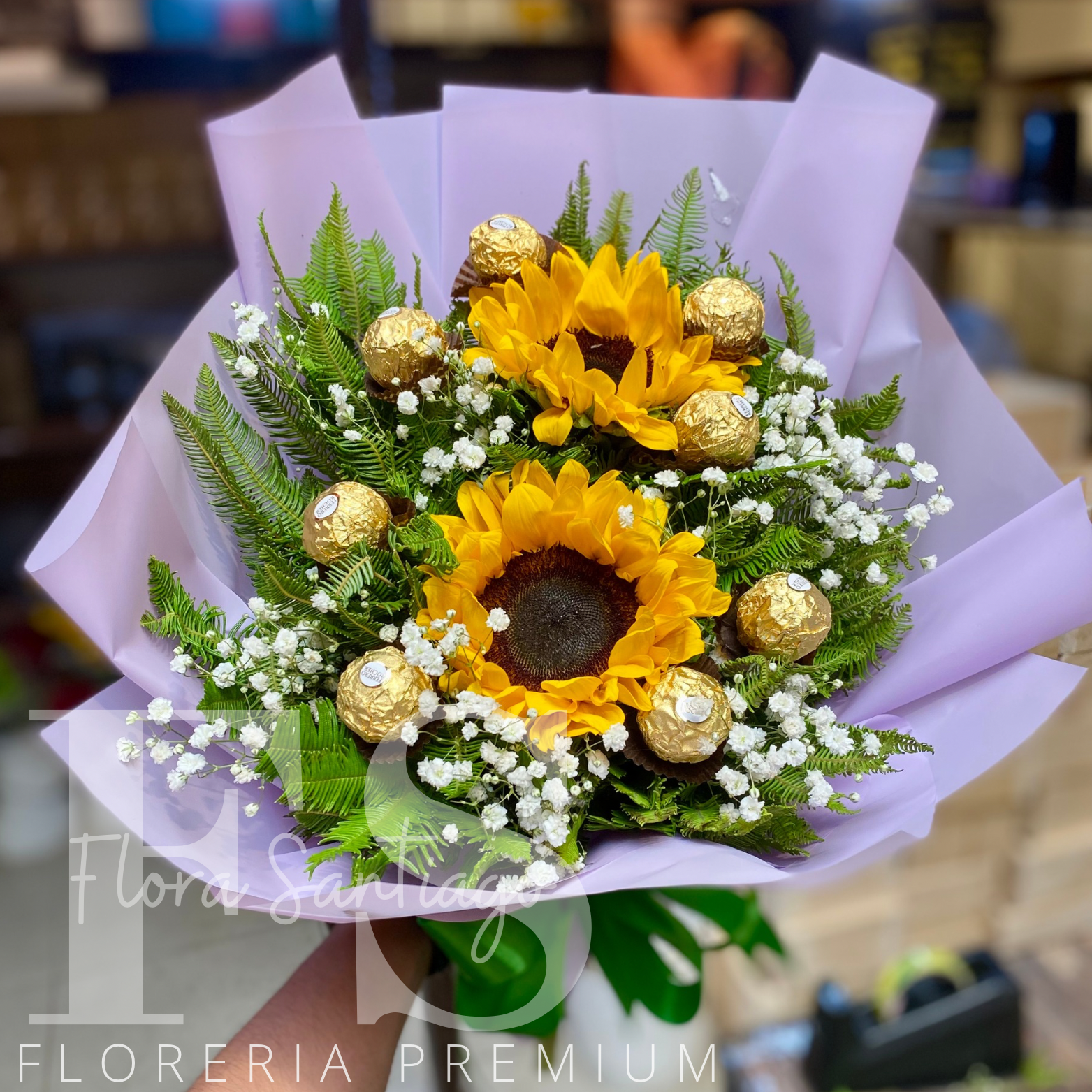 "Este encantador ramo combina la alegría de dos brillantes girasoles con la indulgencia de ocho exquisitos bombones de chocolate Ferrero. Envuelto cuidadosamente para regalar, este detalle es perfecto para iluminar el día de alguien especial, combinando la frescura de las flores con la dulzura del chocolate en una presentación elegante y memorable."