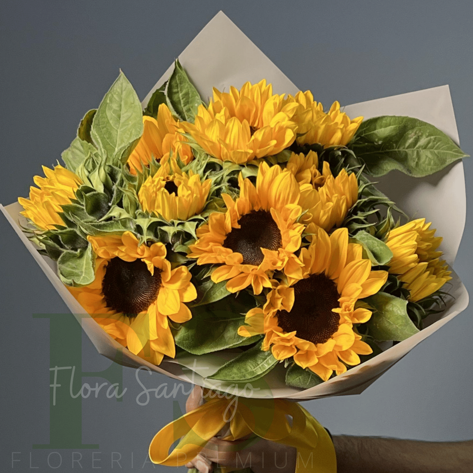 "Un radiante ramo de 10 girasoles envuelto en un elegante papel, resplandece con la energía del sol. Un regalo que ilumina cualquier espacio, irradiando alegría y vitalidad con su belleza natural."