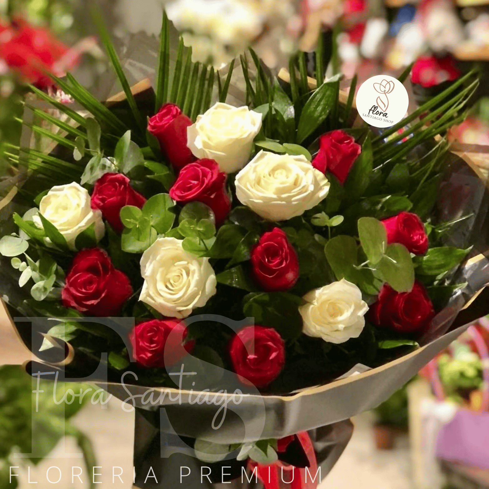 Hermoso Ramo Con 10 rosas rojas y 5 rosas blancas envuelto en papel para regalar envía flores a domicilio En Santiago todos los días